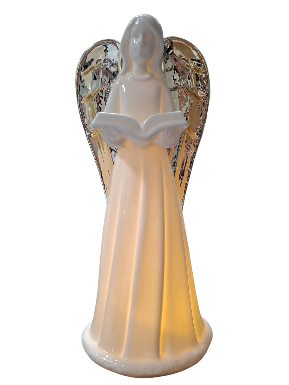 Produzido em porcelana de alta qualidade, o anjo possui acabamento fino e design suave, que ganha ainda mais beleza com a iluminação LED interna, criando um brilho acolhedor que destaca cada detalhe da escultura. Seu tamanho de 30 cm de altura por 12 cm de largura torna a peça ideal para ganhar destaque em salas, quartos, escritórios, oratórios e halls de entrada.