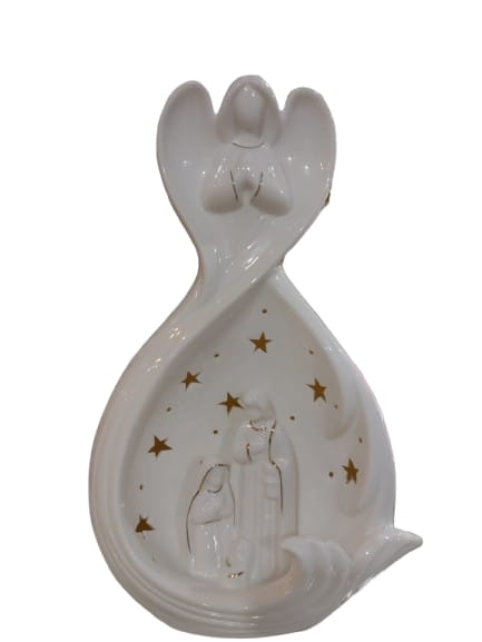 Confeccionada em porcelana de alta qualidade com um acabamento branco elegante e detalhes finos, esta escultura se destaca pela sua beleza e delicadeza. A iluminação LED suave e encantadora realça a cena da Sagrada Família, proporcionando uma atmosfera de serenidade e espiritualidade.