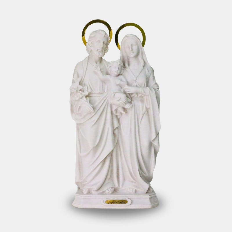 Esta peça possui acabamento detalhado, com roupas e expressões que refletem o respeito à tradição cristã. A imagem está montada em base reforçada e contém uma plaquinha com o nome "Sagrada Família". Ideal para quem busca a fé.
