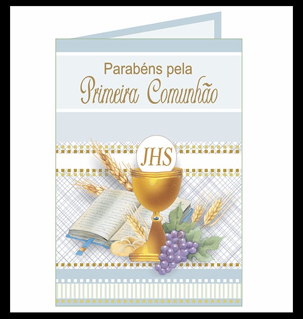 Cartão especialmente criado para celebrar a Primeira Comunhão, com design que une símbolos cristãos e uma mensagem que inspira fé e bênçãos.