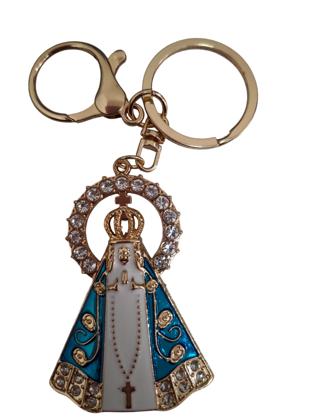 Este chaveiro apresenta a figura da Nossa Senhora Aparecida em relevo colorido, com vestes em tons de azul e branco, além de detalhes em metal dourado na áureola decorada com pedras de strass transparentes. A peça é equipada com argola circular tradicional e mosquetão, facilitando o manuseio e fixação em bolsas ou cintos. Ideal para quem deseja unir proteção e um toque de elegância no dia a dia.