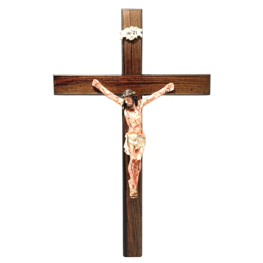 O crucifixo possui 40 cm de altura e é composto por uma base de madeira sólida e um Cristo esculpido em resina, permitindo maior nitidez em detalhes e maior resistência ao tempo. A peça traz o tradicional símbolo cristão, com acabamento que remete à arte sacra clássica.