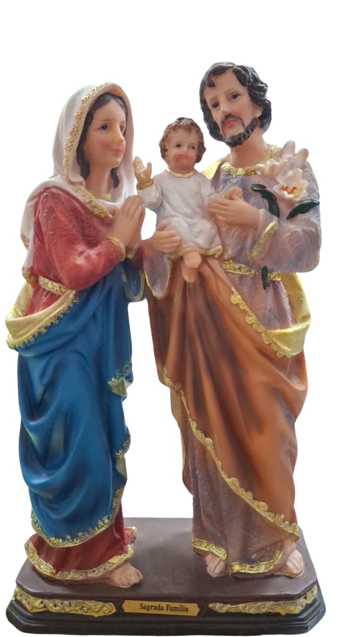 A peça possui aproximadamente 30 cm de altura, com cores vivas que valorizam cada detalhe das vestes e expressões. O acabamento dourado nos trajes acrescenta um toque especial que chama atenção e realça a importância da representação. Perfeita para momentos de oração, contemplação ou para integrar coleções de arte sacra.