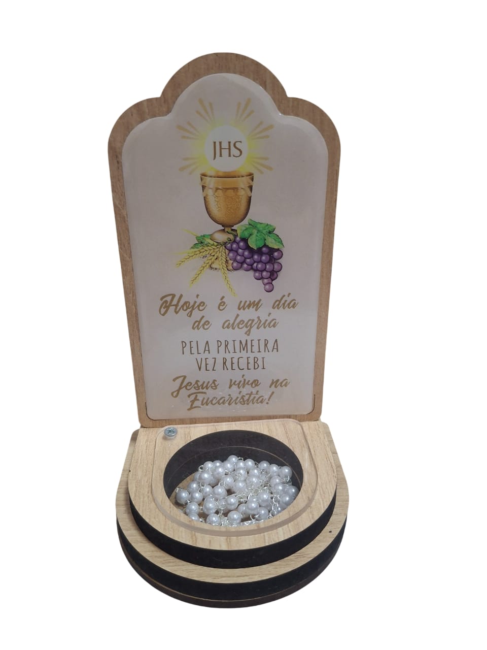 Item ideal para celebrar a Primeira Eucaristia com fé e simbolismo, unindo o terço a uma base personalizada.