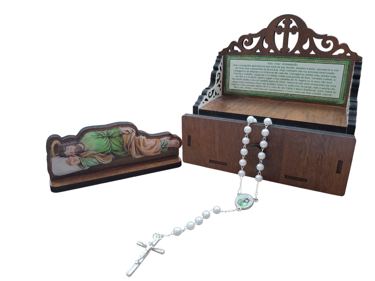 Fabricado em MDF resistente, o oratório apresenta uma abertura frontal com gaveta de puxador redondo para facilitar o acesso ao interior. A peça inclui um terço que pode ser guardado e mantido protegido dentro da gaveta. A imagem de São José retrata-o em posição de descanso, convidando à paz e à proteção espiritual.